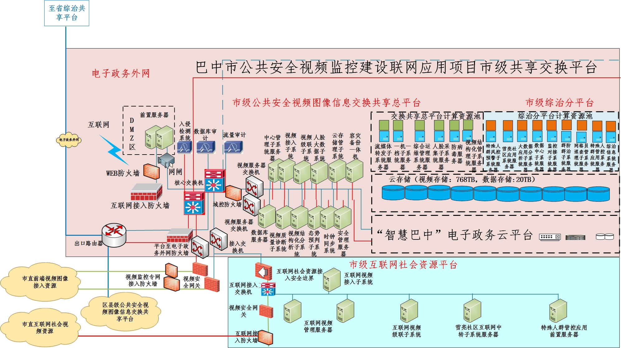 市级公共安全视频图像信息交换共享总平台以公共安全视频图像信息资源共享为核心,以资源共享、业务协同为目标,依托巴中市智慧城市、“智慧巴中”电子政务云平台的云计算为基础技术架构,按照按需服务的设计思路,构建统一的云计算、存储资源池,提供应用快速部署和资源动态分配能力,实现资源统一管理和调配。平台建成后,全市形成全域覆盖、整体防控、协同联动、共建共享的治安防控格局。