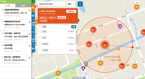系统对事发现场进行迅速查找、定位,并准确、直观地回传到指挥中心的控制系统。再通过图上指挥平台和GPS定位系统的处理,可以在显示系统上集中调出事发地段现场和周边的水、电、气、交通、通信、人员、警力以及装备设施等实时信息,借助应急联动系统协同通报公安、消防、医疗、电力、通信、卫生等相关部门,统一组织应急举措的实施。