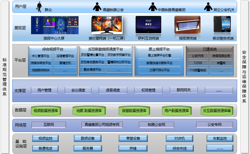 反恐指挥中心项目的总体架构是一个多级的分层结构,总体体系架构分为用户层、展现层、平台层、支撑层、数据层、网络层和基础设施层,同时与铁路公司已建的铁路综合视频监控、列车视频监控、机车视频监控、实名制售票系统、实名制验票系统、铁路货运实名制系统、中铁快运实名制系统实现系统对接和数据共享;实现与公安已建成的全国在逃人员信息系统、铁路公安实名制信息应用系统等相关平台(系统)对接,实现数据共享功能整合,并提供相应的标准规范管理体系、安全保障和运维保障体系。