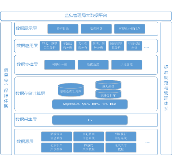 总体的建设目标是依托大数据技术,以工程化、项目化方式,充分运用分析技术,构建合理的大数据应用使用流程,建立考核机制,形成狱警巡查跟踪;精准判断犯罪人行为,形成犯罪画像,做到提前识别、感知变化、预防罪犯自身的改造过程。大数据平台作为数据交换中心和数据共享中心,需要实现数据的集中交换和集中存储,因此,对各部门之间的输入数据及输出数据都要全面梳理,分析出需要集中交换与共享的数据,并制定数据标准、交换标准、目录标准,最终实现各部门之间的数据共建共享。
