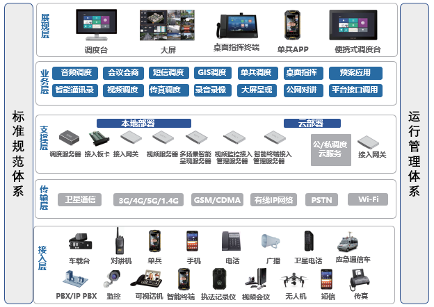 华迈基于当前应急指挥需求,提供一套集“指挥快速、跨领域、跨层级、高效精准”多目标于一体的应急管理指挥调度体系,满足客户针对不同环境下应急指挥联动。系统架构如下: