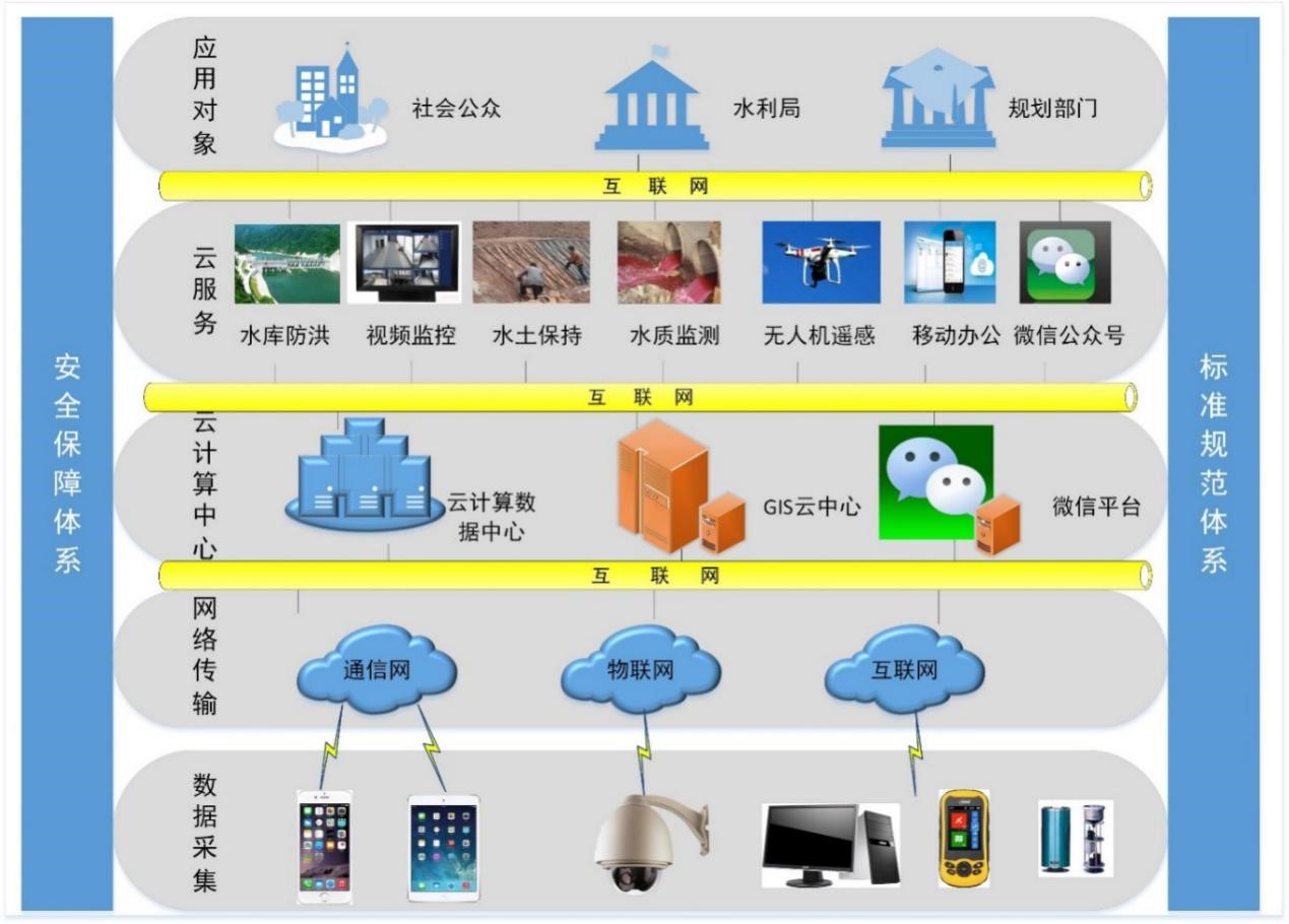 在水利业务梳理和分析的基础上,按照智慧水利顶层设计的思路,借鉴目前国际国内同类项目建设经验。总体框架主要包括智慧水利数据采集层、传输网络、云计算中心、云服务等,总体框架以安全体系和标准体系为支撑,实现系统的安全化、统一化、标准化运行。