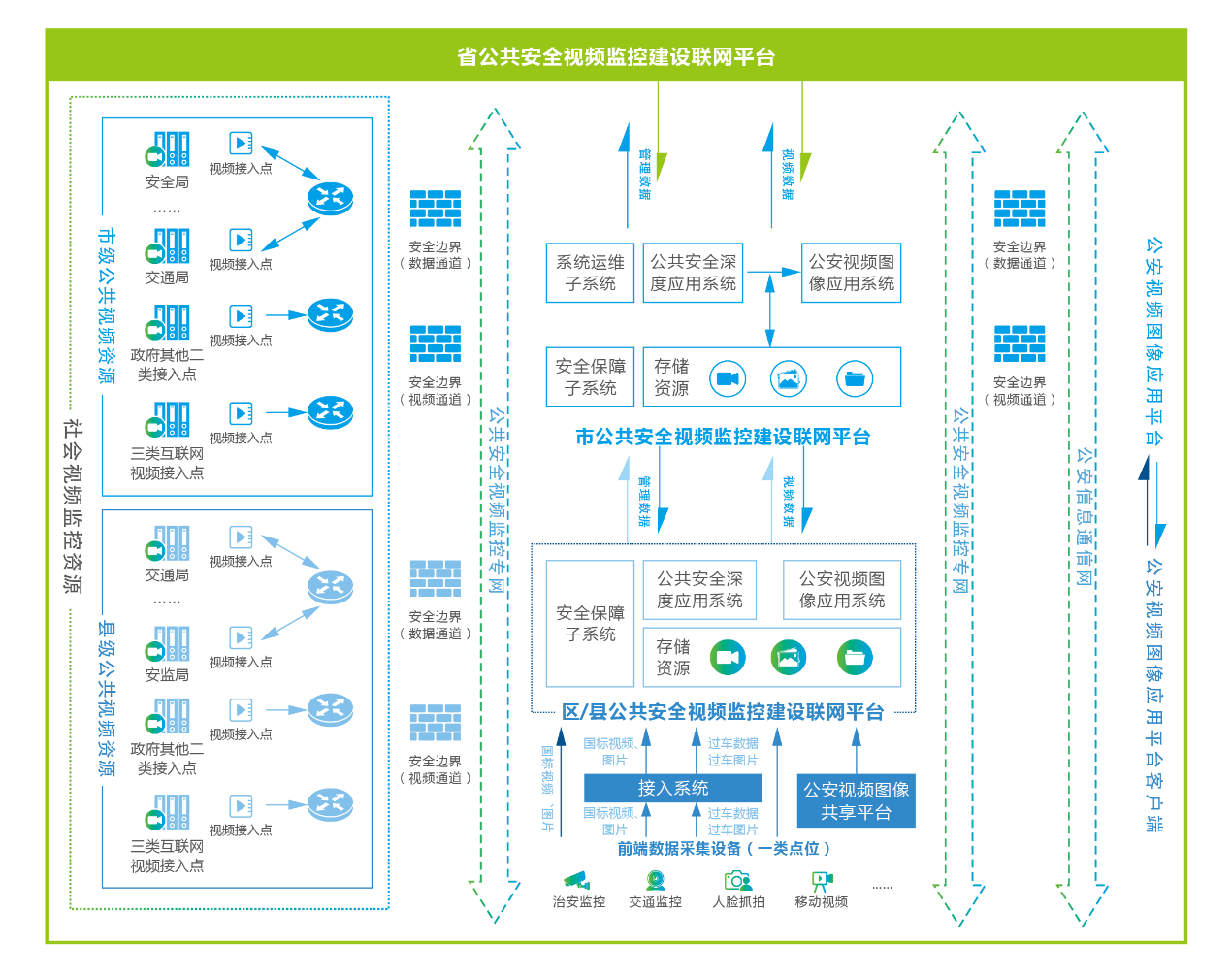 根据《公共安全视频监控建设联网应用“十三五”规划方案》要求,构建省、市、区/县三级公共安全视频图像信息共享平台,实现多级共享平台纵向级联贯通。